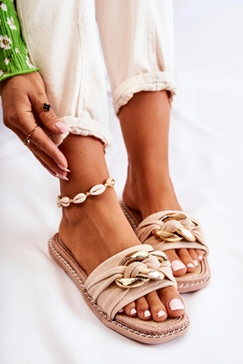 Zamszowe Klapki Z Ozdobnym Łańcuchem Beżowe Louie