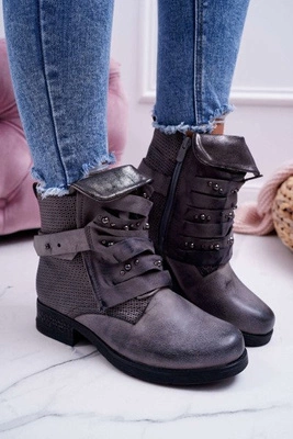 Damskie Botki Płaski Obcas Ciepłe Szare Debra