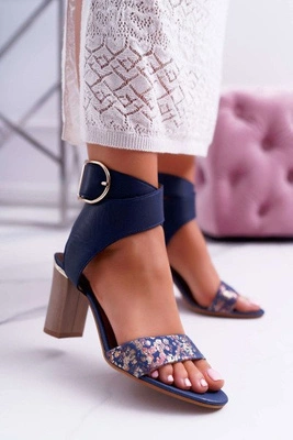 Skórzane Damskie Sandały Maciejka Na Słupku Granatowe 03597
