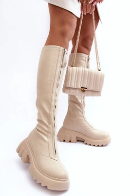 Skórzane Kozaki Na Masywnej Platformie Z Suwakiem Beżowe Ringo