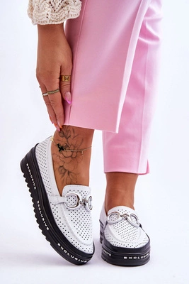 +1Klasyczne Skórzane Ażurowe Mokasyny Z Ozdobą Białe Rendy