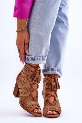 Zamszowe Ażurowe Botki Na Koturnie Camel Berthe