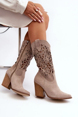 Zazoo 3414 Damskie Ażurowe Botki Na Słupku Zamszowe Cappucino