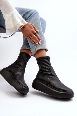 Zazoo 3395 Skórzane Botki Damskie Na Masywnej Platformie Czarne