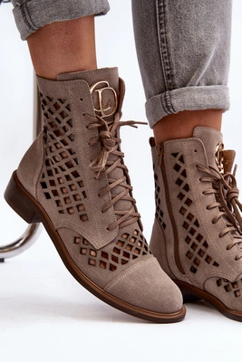 Zazoo 2695 Ażurowe Skórzane Botki Beżowe