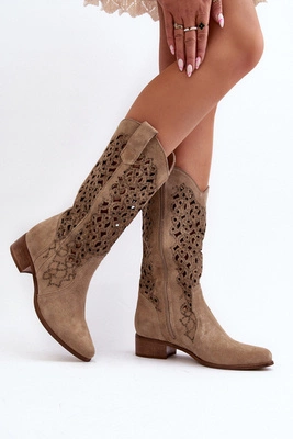 Zazoo 3403 Ażurowe Kozaki Damskie Na Niskim Obcasie Jasnobeżowe