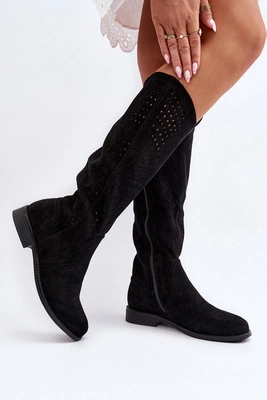 S.Barski HY66-150 Ażurowe Kozaki Na Płaskim Obcasie Czarne
