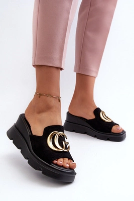 Klapki Damskie Z Eko Zamszu Na Koturnie I Platformie Ze Złotą Ozdobą Vinceza 58295 Czarne