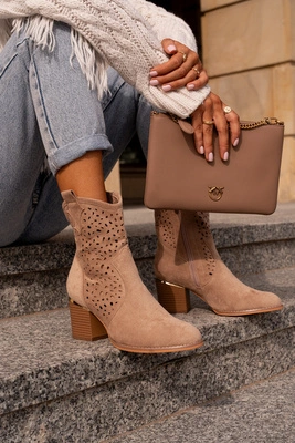 Ażurowe Botki Na Słupku Z Eko Zamszu Zapinane Na Zamek Ciemnobeżowe Sevana