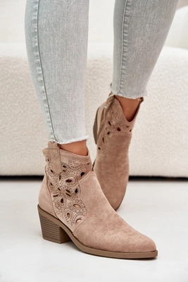 Damskie Zamszowe Ażurowe Botki Kowbojki Beżowe S.Barski HY42-086