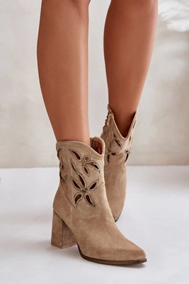 Zamszowe Ażurowe Botki Na Słupku Lewski 3629 Beżowe