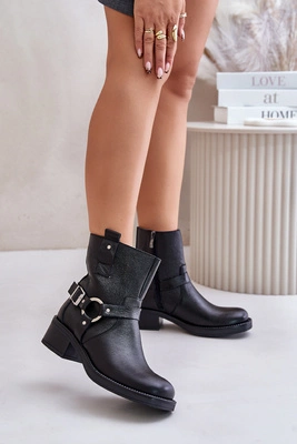 Zazoo 2942 Skórzane Botki Workery Ze Złotą Klamrą Czarne