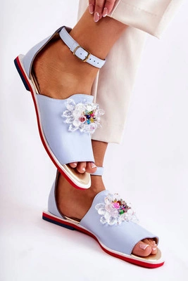 +4Damskie Skórzane Sandałki Z Ozdobą Niebieskie Nevassa