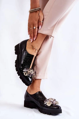 Eleganckie Lakierowane Półbuty Z Ozdobą Krokodyl Czarne Cindy