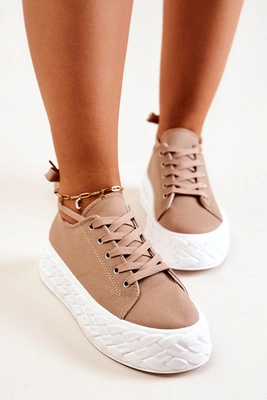Trampki Damskie Na Masywnej Platformie Z Ozdobnym Sznurowaniem Beżowe Zidora